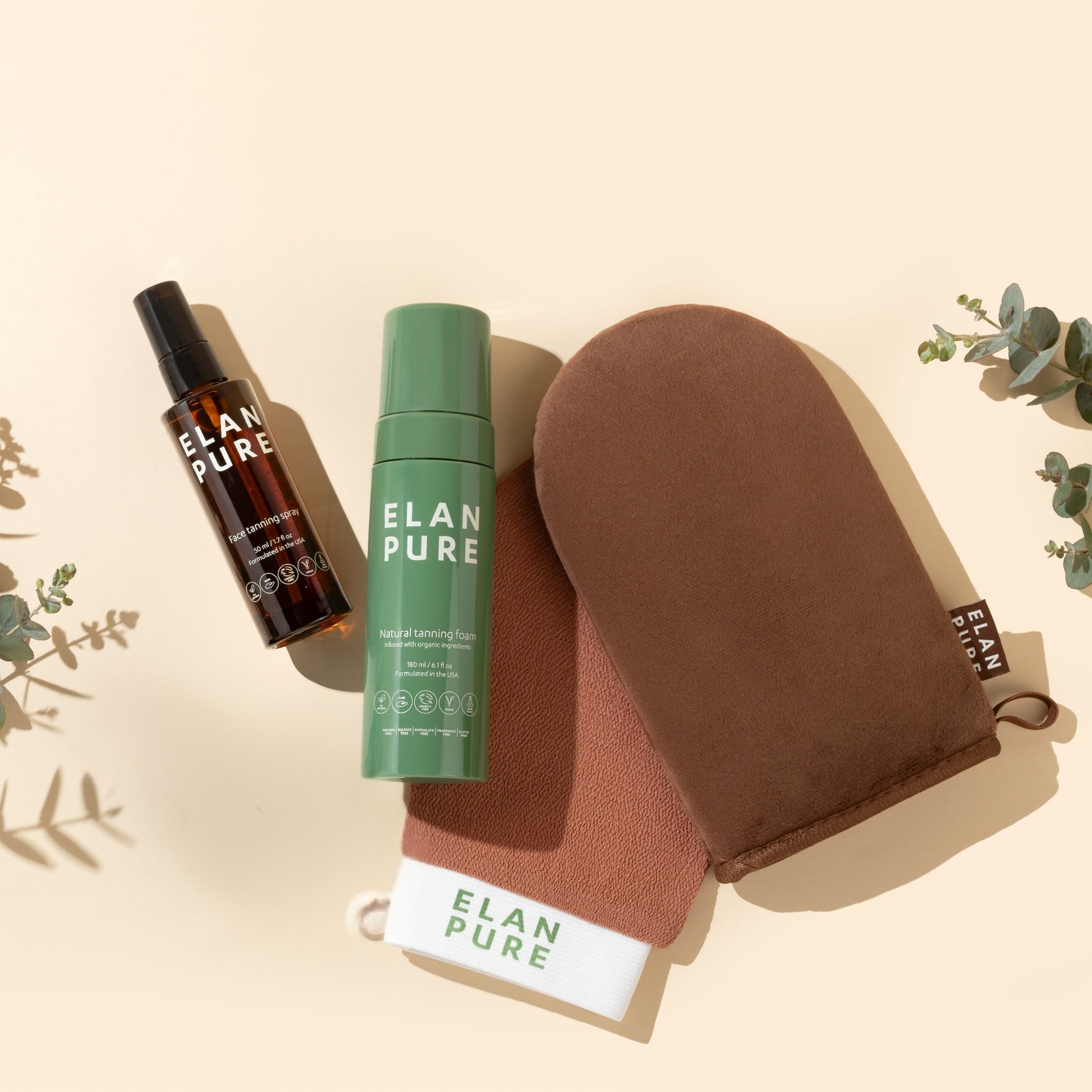 Bundle and Save with Elan Pure's Non-Toxic Self-Tan, Application Mitt and Exfoliator Mitt. The perfect set for a streak-free, long-lasting, natural glow.